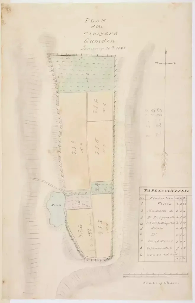 On the family’s return to London, John Macarthur entrusted his collection of cuttings to a nurseryman while a convict ship, installed with a special greenhouse, was being prepared. After arriving back in Sydney in 1817, the vine cuttings were planted out at Camden Park’s newly established plant nursery. Three years later, in 1820, when the vines yielded their first crop, it was realized that most of the vine-stock material shipped was not what they had collected. Most of the varieties were already available in New South Wales.