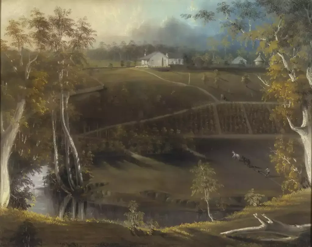 Small vineyards were established inland from Sydney Cove along the Parramatta River and surrounding slopes between 1788 and 1800. This area was originally known as the Eastern Farms (later Ryde). But as more settlers arrived, conflict with the local First Nations population intensified. The New South Wales Corps found itself preventing valuable farmland and crops from being torched.