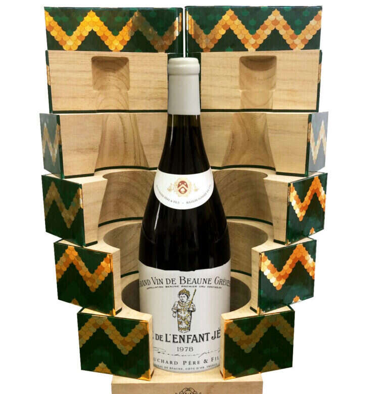The artisanal limited-edition box for the Vigne de l’Enfant Jésus 1978 fans out five ways to reveal a magnum of the Beaune Premier Cru Grèves on an oak platform. Only 100 magnums and boxes, each individually numbered, are available. A second special case contains one bottle each of two of Bouchard’s Beaune premier cru monopoles, one white, one red, from the latest released vintage: 2018 Beaune Clos Saint-Landry, from the historic vineyard where the town’s oldest traces of Chardonnay were found; and 2018 Beaune Clos de la Mousse, from another symbolic vineyard, dating back to 1220, when it was bequeathed to the Chapter of Notre-Dame de Beaune.