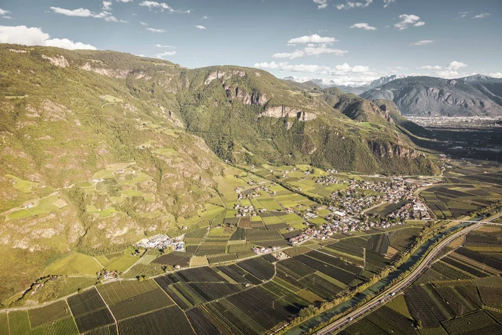 The Adige River valley extends northwest from Bolzano, the regional capital, to Merano, a neoclassical spa town with elegant promenades once frequented by Princess Sissi of Austria. Shielded from cold temperatures by the Monte Monzoccolo plateau at some 6,600ft (2,000m), and the Alps and Dolomites extending farther to the north and east respectively, thriving palm trees along the roadside and prickly pear cacti in the vineyards disconcertingly bear witness to a benevolent and warm climate. The commercial cultivation of apples is the mainstay of the alluvial valley. Grapes are grown on the higher terraces and lighter soils of weathered quartz porphyry and free-draining silica.
