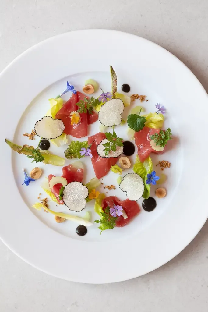 The Barolo menu grew out of lockdown, when Crippa was researching life in the Langhe and the history of Barolo. Discovering that Barolo was already being served in the royal House of Savoy during the 19th century with dishes such as risotto, venison, and hare, he reinterpreted these, together with peasant dishes of the region—all the while keeping the vegetable element that is a linchpin of his cuisine. Every morning, he goes to choose from among the heritage varieties of common vegetables and up to 400 other vegetables, herbs, and edible flower species cultivated in Ceretto’s own organic and biodynamic garden and greenhouse. On the morning I visited, he had long since departed with all of his pickings for the day ahead.