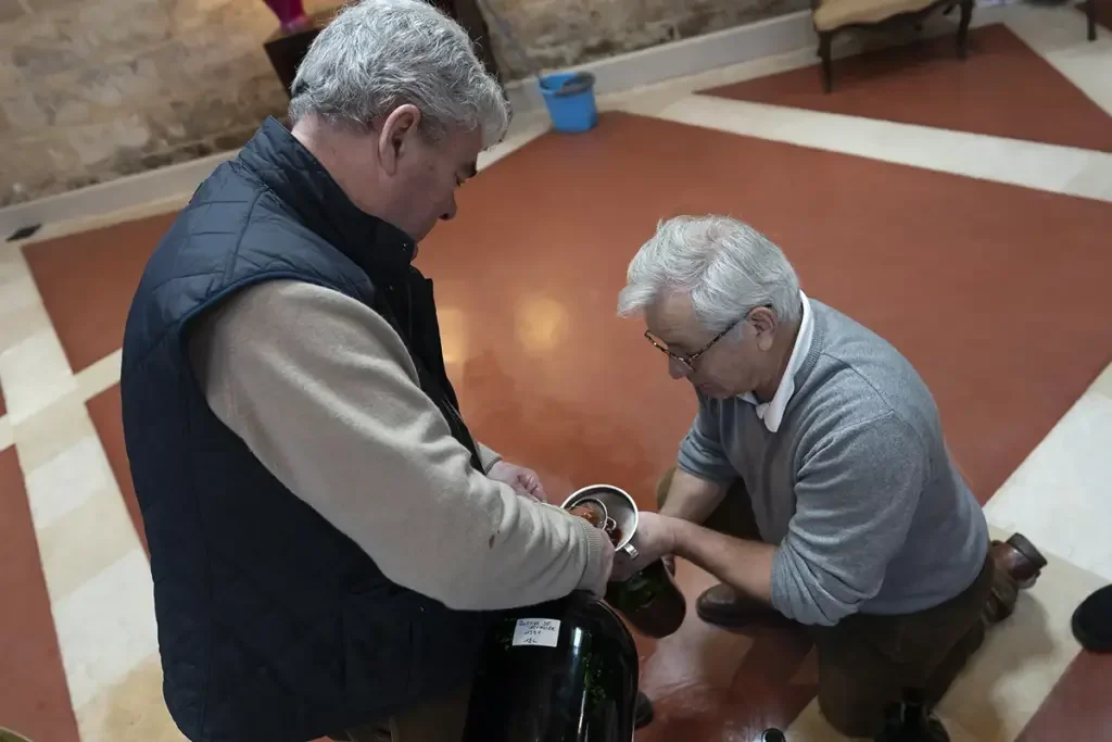 So, it’s a good time to celebrate, with a double magnum of the red wine from each of the 40 years to be auctioned at Christie’s London. In some years, it transpires, there are no double magnums in the cellar. One misty day in late March is therefore set aside to decant, rebottle, recork, and capsule from (even) larger formats to ensure that each year is now represented by two double magnums, one for the auction, one for library stock. I am privileged to witness what turns out to be (as is so often the case chez Bernard) a family affair, with wife Anne and son Adrien both assisting, along with winemaker Louis de Bouglon and, of course, honorary family member Rémi. A symphony of cork, wax, and cascading wine ensues, with small samples of each wine poured for me to taste before the addition of protective sulfur dioxide and the recorking. In the great hall of the hunting lodge, with thick stone walls, a massive fireplace, oak beams, 19th-century oil portraits, and (rather surprisingly) chinoiserie, the bottles are gradually lined up on a long trellis table. The work takes the whole day, and demands great attention to detail in terms of sediment, levels, and the like. Rémi needs to hold the double magnum as Olivier carefully stands over him to decant from the larger format—a vinous pietà, silence as it takes place.