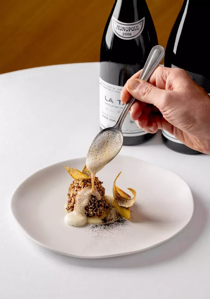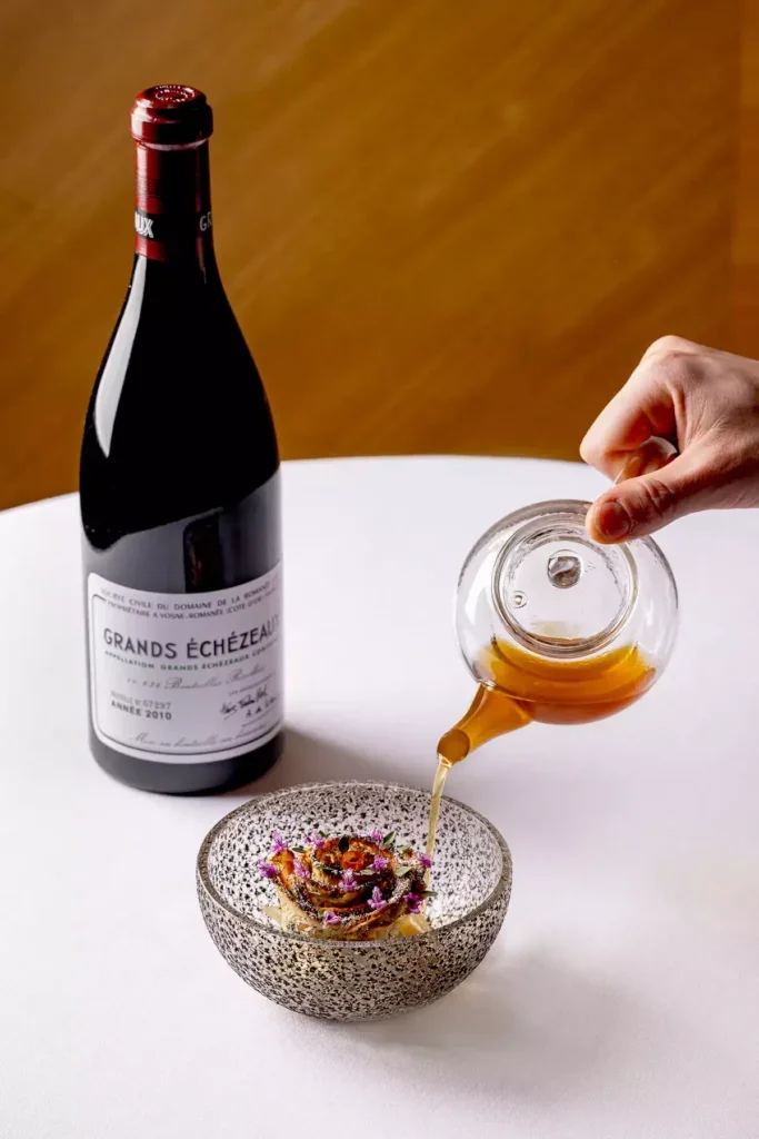 Very few hotels or restaurants offer Domaine de la Romanée-Conti wines by the glass, but it is something that The Connaught does. Not only was the Domaine an obvious choice for their fine wine and food program, but such a dedicated dinner was often suggested by regular diners in the restaurant. And the bringing together of the Domaine and consumers interested in top wines seemed an obvious if clearly not straightforward objective for all: the Domaine, its UK agents Corney & Barrow, the hotel and the restaurant. Planning began in the summer of 2024, with a visit to the Domaine and then consultation with Adam Brett-Smith, Corney & Barrow’s managing director, as to what wine lineup would make sense. The choice was guided by a combination of drinking windows and wines of which The Connaught had at least three bottles in the cellar. The wine and food pairings were then chosen according to the wine/vintage combinations and the dishes that Hélène, herself a considerable wine enthusiast, thought would best complement the wines in question.