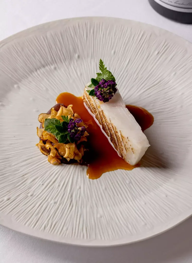 A quite magnificent rendition of France’s traditional “onion soup”. Both the Cevennes onions and the Fumaison cheese originate in the mountains of southern central France. The Cevennes onions are particularly sweet and delicate, slightly caramelized here, and the melting Fumaison cheese base has a fantastic scent, smoky in character, alongside the similarly smoke-imbued, salty Iberico ham; and all this intensity and richness was cut and complimented by the very clear lemon thyme aromas, and wonderfully “textured” by the wafer-thin, crisp, toasted feuilleté circles of sourdough—the most aristocratic of croutons! Onion soup? Hmm. This was a quite extraordinary conception of remarkable scent and complexity.