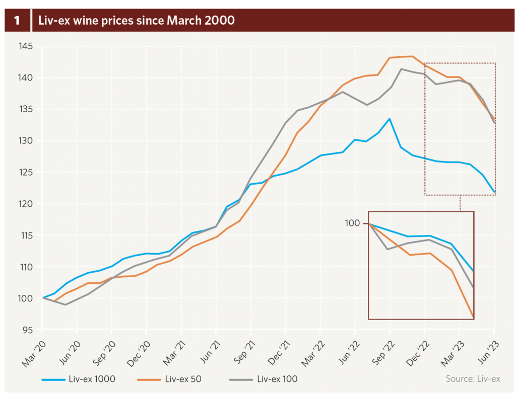 Indeed, when I asked George Wilmoth, head of sales at leading UK merchant, Justerini & Brooks, where the wine market might be heading in 2023, he deferred his answer: “Ask me again in September,” he said. A quieter market during the summer is usual, but it’s hard to know whether the current cooling-off period will extend into fall and beyond. So far this year, Liv-ex numbers all point toward market deceleration. The platform’s widest measure, and the biggest performer of 2022—the Liv-ex 1,000—dropped 6 percent between January and June this year (fig. 1). Its siblings, the Liv-ex 100 and Liv-ex 50, declined by 3.5 and 3 percent respectively. On the one hand, these are not big numbers relative to financial indices. The S&P 500 dropped 5.8 percent in one month between August and September 2022, finishing last year with a net annual loss of 19 percent. On the other hand, the Liv-ex 1,000’s rate of decline (1.17 percent per month) over the past six months matches exactly the average pace of its unprecedented upward climb from March 2020 through mid-September 2022. They say the faster the climb, the harder the fall, but at least the Bordeaux first-growth index—the Liv-ex 50—provides a cushion to soften the impact. Its journey down in 2023 (so far an average monthly loss of 0.79 percent) is at least slower than its previous rise (of 0.93 percent per month). Commenting on this year’s downward trend, Robbie Stevens, senior broker for Liv-ex reminds me, “The wine market is naturally cyclical.” Indeed, after such a surge, and considering the current context of muted demand, we should probably expect further falls for Liv-ex indices in 2023.