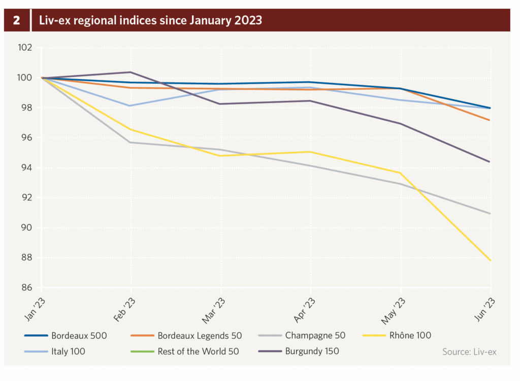 Regionally speaking, the table of relative success has turned in 2023. Liv-ex’s wider Bordeaux measure—the Bordeaux 500—has been the platform’s least worst performer so far this year (losing 2 percent since January 2023). The resilience of Bordeaux in harder times is not new, though O’Connell comments that its performance—in terms of pricing and trading density—could have been better, had this year’s en primeur sales proved successful. He notes that high prices for 2022 not only made for a small campaign, they also “failed to generate the usual enthusiasm and momentum for the region as a whole.” Indeed, despite some trading activity related to recent deliverable vintages, Arthur Coggill, associate director and fine-wine buyer at Goedhuis & Co, tells me, “Our buying director said it was the worst campaign he’d seen in 20 years.” He goes on to note, “The campaign’s poor momentum and misinformed pricing extinguished interest from buyers who were otherwise poised to invest, either because they had set money aside to do so, or because they buy en primeur systematically each year.” Despite this, Bordeaux has seen its market share increase on Liv-ex’s exchange, from 34 percent last year, up to 39 percent as of June 2023. For the small group of collectors forced to liquidate some of their wine holdings, Bordeaux seems to be the first port of call. “It’s certainly not what I would rush to sell, but people always seem to get rid of their Bordeaux first,” observes Wilmoth. He elaborates by explaining, first, that collectors tend to be less emotionally attached to Bordeaux than other regions; and second, that the strong returns observed thus far for Burgundy entice owners to hold these wines closer to the chest. Minute volumes of each cuvée also likely mean that the Burgundy that collectors have acquired will be more difficult to replace in future, whereas mature Bordeaux is still relatively available. Any discounted Burgundy trades on the Liv-ex exchange contributing to the Burgundy 150 index’s losses of 6 percent since the start of 2023 are more strategic; their sellers still earn strong net gains following the index’s recent ascent (70 percent between March 2020 and end 2022), and opportunistic buyers are still poised to snap up ultra-rare stock. The behavior of Liv-ex’s Champagne index appears similar…