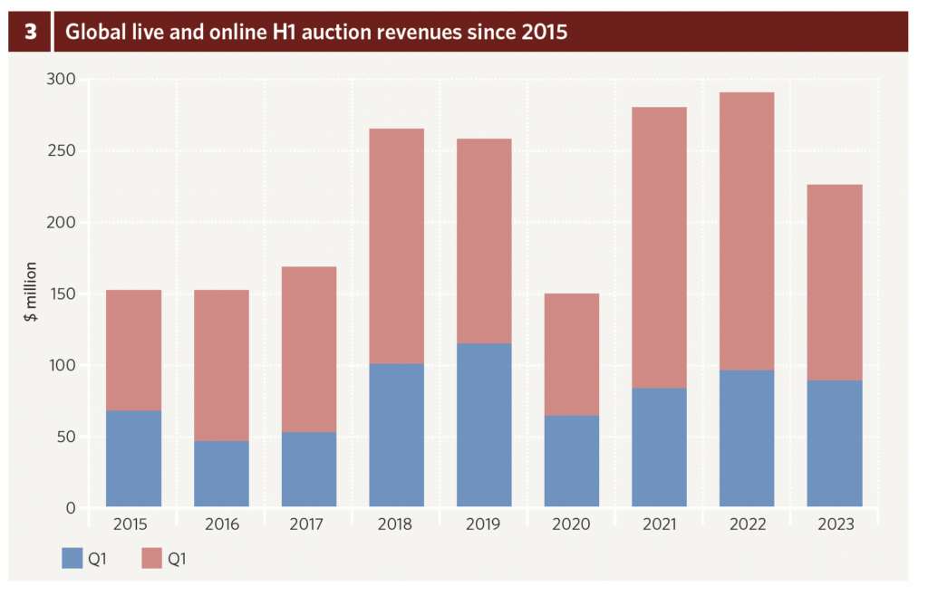 Live and online auction revenues totalled $226 million in the first half of 2023—down 21 percent on last year’s record-breaking H1 (fig. 3). While sales still look buoyant compared to the Covid-stricken results of 2020, this year’s decrease is significant enough to fall below 2019 and 2018 levels—a definitive sign of decline in global demand.