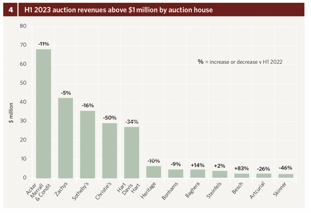 Indeed, all three major markets—the US, Europe, and Asia—report revenue reductions compared with H1 2022. The US maintains its position as top continent for wine auctions, taking a 57 percent share in sale revenues (equal to $129 million) for the first half of 2023. Its relative stability is also evident, as the market that has lost the least ground when compared to the first half of 2022: American auctions in H1 2023 were down 15 percent in value, whereas Asia—comprising sales in Hong Kong and Singapore—registered a loss of 30 percent (at $67 million). Europe’s auction total for January to June 2023 stands at $30 million, 26 percent down on the same period last year. And while global giants, aka “the big five”—Acker Merrall & Condit, Zachys, Sotheby’s, Christie’s, and Hart Davis Hart—still dominate the market, they have all suffered the consequences of muted enthusiasm for active buying of fine wine in 2023 thus far. Acker Merrall & Condit remains the world’s biggest auction house by value, earning $67 million in wine sales in the first half of 2023—a decrease of 11 percent on last year’s H1 achievement (fig. 4). Its compatriot Zachys registers an H1 result of $42 million, closing the gap on its rival with a smaller comparable decrease of 5 percent. Perhaps expectedly, all but three further auction outfits achieving six-month sale totals above $1 million reflect market decline. Those showing growth on the same period last year—Swiss houses Steinfels and Baghera, and Cannes-based Besch—are perhaps testament to the power of micro-markets, since they benefit from respective local (and more loyal) audiences.