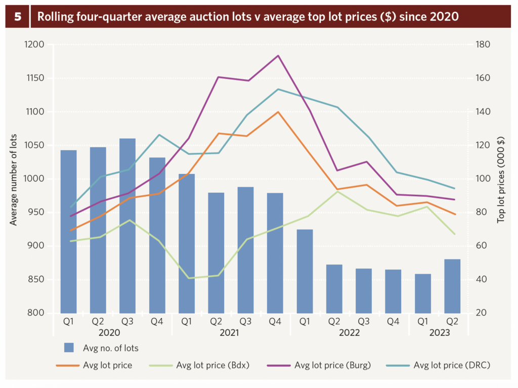 And while pockets of interest are still bound to crop up for the ultra-rare and desirable stocks, further evidence of a down-cycle can be found in lot volumes and top lot prices. Analysis of four-quarter rolling averages since 2020 suggests that both buyers and the access to high caliber lots attracting strong demand have decreased since the auction market peaked toward the end of 2021 (fig. 5). Thereafter, the average top-lot hammer price of live auctions has fallen steeply, by 43 percent between Q4 2021 and Q3 2023. Regionally, Bordeaux top lots were slower to peak than Burgundy, reaching a high in Q2 of last year before then declining 38 percent to end June 2023. Burgundy top-lot prices have been in freefall since the end of 2021, dropping a frightening 49 percent. And while Burgundy top lots show signs of stabilizing overall—with prices virtually flat for the past two quarters—the region’s dominating auction star, Domaine de la Romanée-Conti, may still have further to fall.