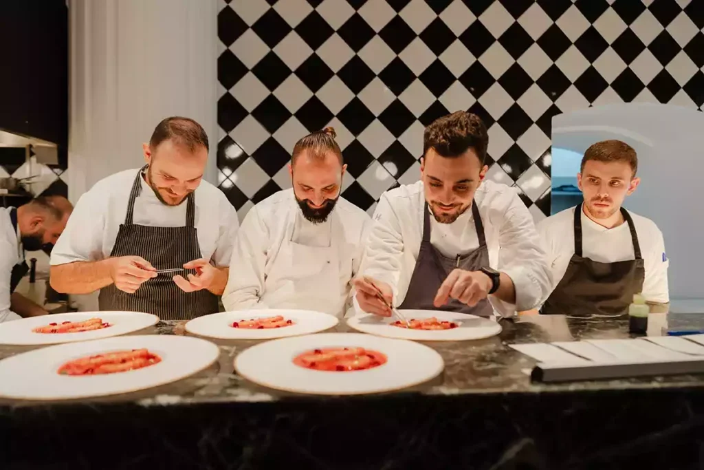 The second evening, there was a “four-hands dinner” dubbed Selene Welcomes Etrusco, featuring chefs Ettore Botrini and Nikos Billis. Among the imaginatively named, impeccably presented dishes were “God Loves Caviar” (caviar, cauliflower, beurre noisette), “Reference to Caravaggio” (red prawns, tomatoes from last summer, wild celery, strawberry), and “Columbina before the Wedding Night” (squab, peach, herbs). It’s always a sign of confidence, as well as a genuine passion for wine, when a producer or sommelier serves wines from another region, as Karakasis did here, including Krug Grande Cuvée (170th edition), Henri Bourgeois Jadis Sancerre 2018, Nervi Conterno Il Rosato 2021, and Marquis d’Angerville Volnay Premier Cru Fremiet 2017. But it was powerful testimony that the only two wines from Santorini were as exciting as any: the Artemis Karamolegos Ftelos Assyrtiko 2020—grand in scale but subtle and gently scintillating (a magnificent match with the “Royale à la Grecque” [lobster broth, shellfish, Greek coffee, curry]); and the Venetsanos Vinsanto 12 Years Old—fresh and herbal, as well as raisined, finely focused, finishing almost dry, with light bitterness and a phenolic nip (perfect with the “Bitter Chocolate Tart” [carob, sweet eggplant, “diktamo” ice cream]).